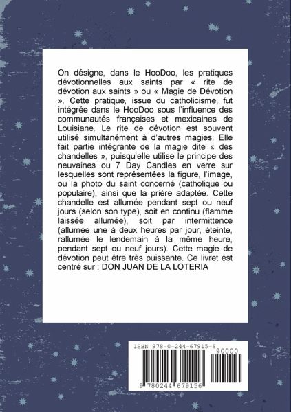 On d¿signe, dans le HooDoo, les pratiques d¿votionnelles aux saints par Ç rite de d¿votion aux saints È ou Ç Magie de D¿votion È. Cette pratique, issue du catholicisme, fut int¿gr¿e dans le HooDoo sous lÕinfluence des communaut¿s fran?aises et mexicaines de Louisiane. Le rite de d¿votion est souvent utilis¿ simultan¿ment ¿ dÕautres magies. Elle fait partie int¿grante de la magie dite Ç des chandelles È, puisquÕelle utilise le principe des neuvaines ou 7 Day Candles en verre sur lesquelles sont repr¿sent¿es la figure, lÕimage, ou la photo du saint concern¿ (catholique ou populaire), ainsi que la pri?re adapt¿e. Cette chandelle est allum¿e pendant sept ou neuf jours (selon son type), soit en continu (flamme laiss¿e allum¿e), soit par intermittence (allum¿e une ¿ deux heures par jour, ¿teinte, rallum¿e le lendemain ¿ la m?me heure, pendant sept ou neuf jours). Cette magie de d¿votion peut ?tre tr?s puissante. Ce livret est centr¿ sur : DON JUAN DE LA LOTERIA