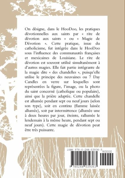On d¿signe, dans le HooDoo, les pratiques d¿votionnelles aux saints par Ç rite de d¿votion aux saints È ou Ç Magie de D¿votion È. Cette pratique, issue du catholicisme, fut int¿gr¿e dans le HooDoo sous lÕinfluence des communaut¿s fran?aises et mexicaines de Louisiane. Le rite de d¿votion est souvent utilis¿ simultan¿ment ¿ dÕautres magies. Elle fait partie int¿grante de la magie dite Ç des chandelles È, puisquÕelle utilise le principe des neuvaines ou 7 Day Candles en verre sur lesquelles sont repr¿sent¿es la figure, lÕimage, ou la photo du saint concern¿ (catholique ou populaire), ainsi que la pri?re adapt¿e. Cette chandelle est allum¿e pendant sept ou neuf jours (selon son type), soit en continu (flamme laiss¿e allum¿e), soit par intermittence (allum¿e une ¿ deux heures par jour, ¿teinte, rallum¿e le lendemain ¿ la m?me heure, pendant sept ou neuf jours). Cette magie de d¿votion peut ?tre tr?s puissante. Ce livret est centr¿ sur : KATERI TEKAKWITHA