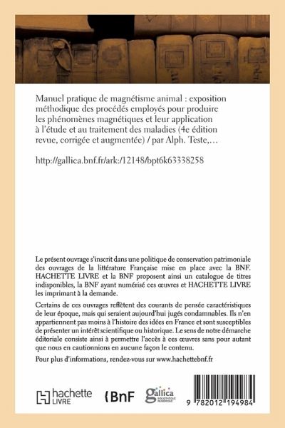 Manuel pratique de magnetisme animal: exposition methodique des procedes employes pour produire les phenomenes magnetiques et leur application a l'etude et au traitement des maladies (4e edition revue, corrigee et augmentee) / par Alph. Teste, ...Date de l'edition originale: 1853Sujet de l'ouvrage: Magnetisme animalCe livre est la reproduction fidele d'une oeuvre publiee avant 1920 et fait partie d'une collection de livres reimprimes a la demande editee par Hachette Livre, dans le cadre d'un partenariat avec la Bibliotheque nationale de France, offrant l'opportunite d'acceder a des ouvrages anciens et souvent rares issus des fonds patrimoniaux de la BnF.Les oeuvres faisant partie de cette collection ont ete numerisees par la BnF et sont presentes sur Gallica, sa bibliotheque numerique.En entreprenant de redonner vie a ces ouvrages au travers d'une collection de livres reimprimes a la demande, nous leur donnons la possibilite de rencontrer un public elargi et participons a la transmission de connaissances et de savoirs parfois difficilement accessibles.Nous avons cherche a concilier la reproduction fidele d'un livre ancien a partir de sa version numerisee avec le souci d'un confort de lecture optimal. Nous esperons que les ouvrages de cette nouvelle collection vous apporteront entiere satisfaction.Pour plus d'informations, rendez-vous sur www.hachettebnf.frhttp: //gallica.bnf.fr/ark: /12148/bpt6k63338258