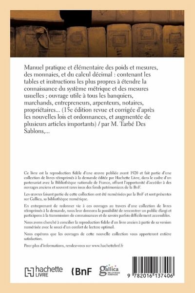 Manuel pratique et élémentaire des poids et mesures, des monnaies, et du calcul décimal: contenant les tables et instructions les plus propres à étendre la connaissance du système métrique et des mesures usuelles; ouvrage utile à tous les banquiers, marchands, entrepreneurs, arpenteurs, notaires, propriétaires... (15e édition revue et corrigée d'après les nouvelles lois et ordonnances, et augmentée de plusieurs articles importants) / par M. Tarbé Des Sablons, ... Date de l'édition originale: 1833 Le présent ouvrage s'inscrit dans une politique de conservation patrimoniale des ouvrages de la littérature Française mise en place avec la BNF. HACHETTE LIVRE et la BNF proposent ainsi un catalogue de titres indisponibles, la BNF ayant numérisé ces oeuvres et HACHETTE LIVRE les imprimant à la demande. Certains de ces ouvrages reflètent des courants de pensée caractéristiques de leur époque, mais qui seraient aujourd'hui jugés condamnables. Ils n'en appartiennent pas moins à l'histoire des idées en France et sont susceptibles de présenter un intérêt scientifique ou historique. Le sens de notre démarche éditoriale consiste ainsi à permettre l'accès à ces oeuvres sans pour autant que nous en cautionnions en aucune façon le contenu. Pour plus d'informations, rendez-vous sur www.hachettebnf.fr