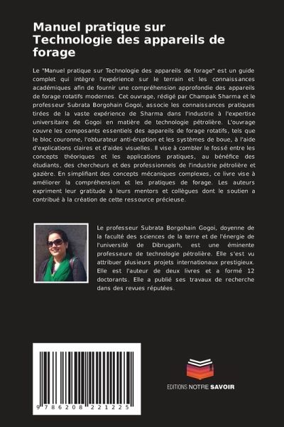 Le "Manuel pratique sur Technologie des appareils de forage" est un guide complet qui intègre l'expérience sur le terrain et les connaissances académiques afin de fournir une compréhension approfondie des appareils de forage rotatifs modernes. Cet ouvrage, rédigé par Champak Sharma et le professeur Subrata Borgohain Gogoi, associe les connaissances pratiques tirées de la vaste expérience de Sharma dans l'industrie à l'expertise universitaire de Gogoi en matière de technologie pétrolière. L'ouvrage couvre les composants essentiels des appareils de forage rotatifs, tels que le bloc couronne, l'obturateur anti-éruption et les systèmes de boue, à l'aide d'explications claires et d'aides visuelles. Il vise à combler le fossé entre les concepts théoriques et les applications pratiques, au bénéfice des étudiants, des chercheurs et des professionnels de l'industrie pétrolière et gazière. En simplifiant des concepts mécaniques complexes, ce livre vise à améliorer la compréhension et les pratiques de forage. Les auteurs expriment leur gratitude à leurs mentors et collègues dont le soutien a contribué à la création de cette ressource précieuse.