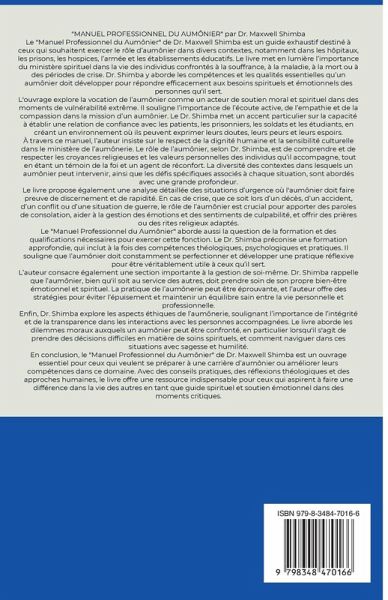 Manuel Professionnel du Aumônier Le "Manuel Professionnel du Aumônier" de Dr. Maxwell Shimba est un guide exhaustif destiné à ceux qui souhaitent exercer le rôle d'aumônier dans divers contextes, notamment dans les hôpitaux, les prisons, les hospices, l'armée et les établissements éducatifs. Le livre met en lumière l'importance du ministère spirituel dans la vie des individus confrontés à la souffrance, à la maladie, à la mort ou à des périodes de crise. Dr. Shimba y aborde les compétences et les qualités essentielles qu'un aumônier doit développer pour répondre efficacement aux besoins spirituels et émotionnels des personnes qu'il sert. L'ouvrage explore la vocation de l'aumônier comme un acteur de soutien moral et spirituel dans des moments de vulnérabilité extrême. Il souligne l'importance de l'écoute active, de l'empathie et de la compassion dans la mission d'un aumônier. Le Dr. Shimba met un accent particulier sur la capacité à établir une relation de confiance avec les patients, les prisonniers, les soldats et les étudiants, en créant un environnement où ils peuvent exprimer leurs doutes, leurs peurs et leurs espoirs. À travers ce manuel, l'auteur insiste sur le respect de la dignité humaine et la sensibilité culturelle dans le ministère de l'aumônerie. Le rôle de l'aumônier, selon Dr. Shimba, est de comprendre et de respecter les croyances religieuses et les valeurs personnelles des individus qu'il accompagne, tout en étant un témoin de la foi et un agent de réconfort. La diversité des contextes dans lesquels un aumônier peut intervenir, ainsi que les défis spécifiques associés à chaque situation, sont abordés avec une grande profondeur. Le livre propose également une analyse détaillée des situations d'urgence où l'aumônier doit faire preuve de discernement et de rapidité. En cas de crise, que ce soit lors d'un décès, d'un accident, d'un conflit ou d'une situation de guerre, le rôle de l'aumônier est crucial pour apporter des paroles de consolation, aider à la gestion des émotions et des sentiments de culpabilité, et offrir des prières ou des rites religieux adaptés. Le "Manuel Professionnel du Aumônier" aborde aussi la question de la formation et des qualifications nécessaires pour exercer cette fonction. Le Dr. Shimba préconise une formation approfondie, qui inclut à la fois des compétences théologiques, psychologiques et pratiques. Il souligne que l'aumônier doit constamment se perfectionner et développer une pratique réflexive pour être véritablement utile à ceux qu'il sert. L'auteur consacre également une section importante à la gestion de soi-même. Dr. Shimba rappelle que l'aumônier, bien qu'il soit au service des autres, doit prendre soin de son propre bien-être émotionnel et spirituel. La pratique de l'aumônerie peut être éprouvante, et l'auteur offre des stratégies pour éviter l'épuisement et maintenir un équilibre sain entre la vie personnelle et professionnelle. Enfin, Dr. Shimba explore les aspects éthiques de l'aumônerie, soulignant l'importance de l'intégrité et de la transparence dans les interactions avec les personnes accompagnées. Le livre aborde les dilemmes moraux auxquels un aumônier peut être confronté, en particulier lorsqu'il s'agit de prendre des décisions difficiles en matière de soins spirituels, et comment naviguer dans ces situations avec sagesse et humilité. En conclusion, le "Manuel Professionnel du Aumônier" de Dr. Maxwell Shimba est un ouvrage essentiel pour ceux qui veulent se préparer à une carrière d'aumônier ou améliorer leurs compétences dans ce domaine.