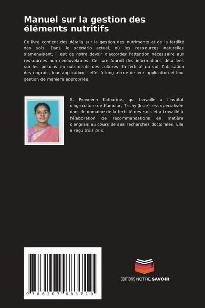 Ce livre contient des détails sur la gestion des nutriments et de la fertilité des sols. Dans le scénario actuel, où les ressources naturelles s'amenuisent, il est de notre devoir d'accorder l'attention nécessaire aux ressources non renouvelables. Ce livre fournit des informations détaillées sur les besoins en nutriments des cultures, la fertilité du sol, l'utilisation des engrais, leur application, l'effet à long terme de leur application et leur gestion de manière appropriée.