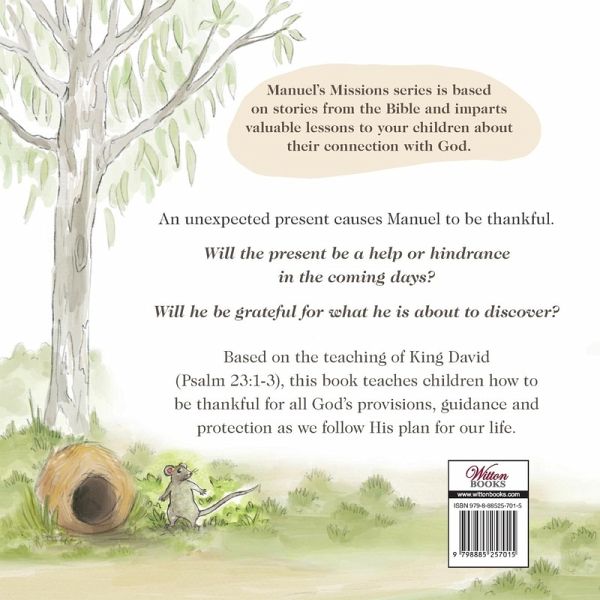 Manuel's Missions series is based on stories from the Bible and imparts valuable lessons to your children about their connection with God. An unexpected present causes Manuel to be thankful. Will the present be a help or hindrance in the coming days? Will he be grateful for what he is about to discover? Based on the teaching of King David (Psalm 23:1-3), this book teaches children how to be thankful for all God's provisions, guidance and protection as we follow His plan for our life.