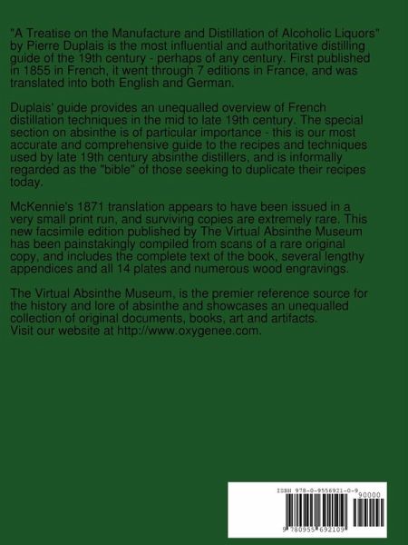 Pierre Duplais' seminal "Traité de la Fabrication des Liqueurs et de la Distillation des Alcools" is the authoritative French distillation guide. It went through seven editions from 1855 to 1900 and is the basis of our understanding of 19th century French distillation techniques. A single English edition was published in Philadelphia in 1871, translated by M. McKennie. The special section on absinthe is of particular importance - this is our most accurate and comprehensive guide to the recipes and techniques used by late 19th century absinthe distillers, and is informally regarded as the "bible" of those seeking to duplicate their recipes today. McKennie's translation appears to have been issued in a very small print run, and surviving copies are extremely scarce. This new facsimile edition published by The Virtual Absinthe Museum has been painstakingly compiled from scans of a rare original copy. This perfect-bound PAPERBACK version is just under 700 pages.