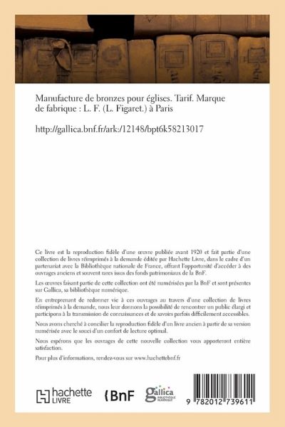 Manufacture de bronzes pour églises. Tarif. Marque de fabrique: L. F. (L. Figaret.) à Paris Date de l'édition originale: 1868 Le présent ouvrage s'inscrit dans une politique de conservation patrimoniale des ouvrages de la littérature Française mise en place avec la BNF. HACHETTE LIVRE et la BNF proposent ainsi un catalogue de titres indisponibles, la BNF ayant numérisé ces oeuvres et HACHETTE LIVRE les imprimant à la demande. Certains de ces ouvrages reflètent des courants de pensée caractéristiques de leur époque, mais qui seraient aujourd'hui jugés condamnables. Ils n'en appartiennent pas moins à l'histoire des idées en France et sont susceptibles de présenter un intérêt scientifique ou historique. Le sens de notre démarche éditoriale consiste ainsi à permettre l'accès à ces oeuvres sans pour autant que nous en cautionnions en aucune façon le contenu. Pour plus d'informations, rendez-vous sur www.hachettebnf.fr