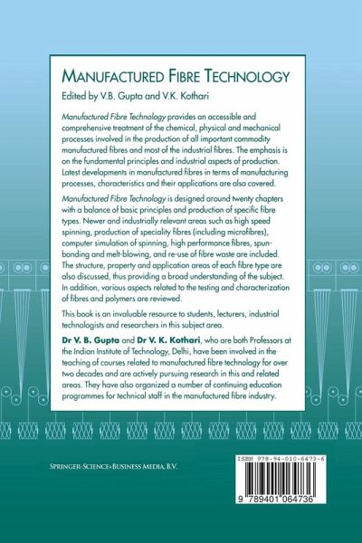 Manufactured Fibre Technology is designed around twenty chapters with a balance of basic principles and production of specific fibre types. Newer and industrially relevant areas such as high speed spinning, production of speciality fibres (including microfibres), computer simulation of spinning, high performance fibres, spun-bonding and melt-blowing, and re-use of fibre waste are included. The structure, property and application areas of each fibre type are also discussed, thus providing a broad understanding of the subject. In addition, various aspects related to the testing and characterisation of fibres and polymers are reviewed.