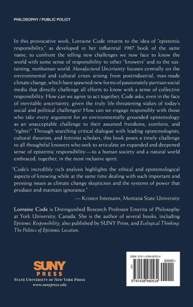 Lorraine Code is Distinguished Research Professor Emerita of Philosophy at York University, Canada. She is the author of several books, including Epistemic Responsibility, also published by SUNY Press, and Ecological Thinking: The Politics of Epistemic Location.