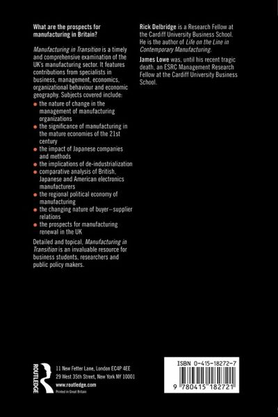 "Manufacturing in Transition" makes a genuinely interdisciplinary contribution to the debate over the UK's strategy for industrial renewal. It looks at the current state of the British manufacturing sector within the global economy and asks whether manufacturing matters in the twenty-first century. The book explores key issues such as: the chances of renewal; developments in the management and organization of operations and supply chains; and the differences made by Japanese methods. This is a timely assessment of the UK's industrial development and makes a major contribution to debates over the industrial strategy and the position of manufacturing within industrialized economies.
