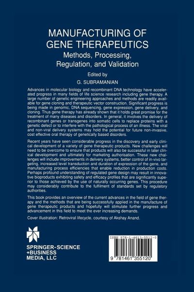 This book provides an overview of the current advances in the field of gene therapy and the methods that are being successfully applied in the manufacture of gene therapeutic products, and hopefully will stimulate further progress and advancement in this field to meet the ever-increasing demands.