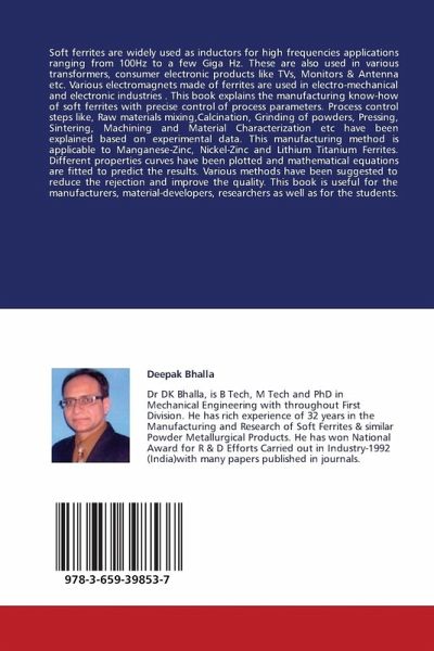Soft ferrites are widely used as inductors for high frequencies applications ranging from 100Hz to a few Giga Hz. These are also used in various transformers, consumer electronic products like TVs, Monitors & Antenna etc. Various electromagnets made of ferrites are used in electro-mechanical and electronic industries . This book explains the manufacturing know-how of soft ferrites with precise control of process parameters. Process control steps like, Raw materials mixing,Calcination, Grinding of powders, Pressing, Sintering, Machining and Material Characterization etc have been explained based on experimental data. This manufacturing method is applicable to Manganese-Zinc, Nickel-Zinc and Lithium Titanium Ferrites. Different properties curves have been plotted and mathematical equations are fitted to predict the results. Various methods have been suggested to reduce the rejection and improve the quality. This book is useful for the manufacturers, material-developers, researchersas well as for the students.