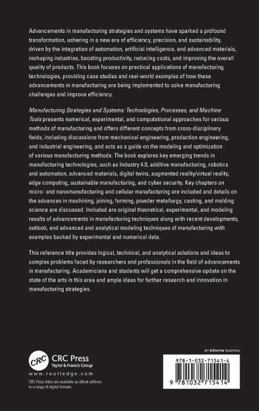 Advancements in manufacturing strategies and systems have sparked a profound transformation, ushering in a new era of efficiency, precision, and sustainability, driven by the integration of automation, artificial intelligence, and advanced materials, reshaping industries, boosting productivity, reducing costs, and improving the overall quality of products. This book focuses on practical applications of manufacturing technologies, providing case studies and real-world examples of how these advancements in manufacturing are being implemented to solve manufacturing challenges and improve efficiency.