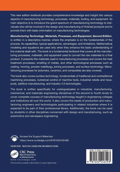 This new edition textbook provides comprehensive knowledge and insight into various aspects of manufacturing technology, processes, materials, tooling, and equipment. Its main objective is to introduce the grand spectrum of manufacturing technology to individuals who will be involved in the design and manufacturing of finished products.