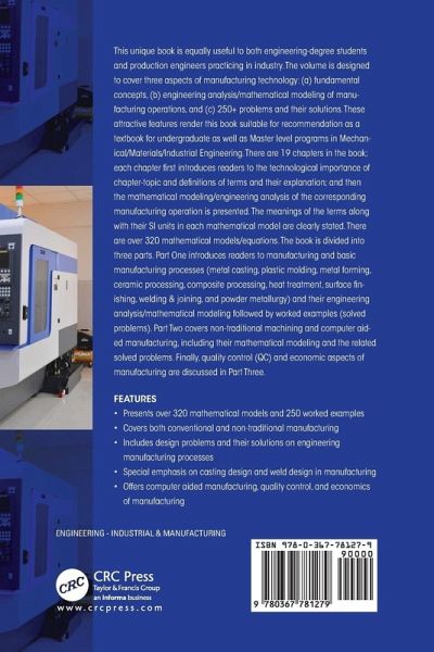This unique book is equally useful to both engineering-degree students and production engineers practicing in industry. The volume is designed to cover three aspects of manufacturing technology: (a) fundamental concepts, (b) engineering analysis/mathematical modeling of manufacturing operations, and (c) 250+ problems and their solutions. These attractive features render this book suitable for recommendation as a textbook for undergraduate as well as Master level programs in Mechanical/Materials/Industrial Engineering. There are 19 chapters in the book; each chapter first introduces readers to the technological importance of chapter-topic and definitions of terms and their explanation; and then the mathematical modeling/engineering analysis of the corresponding manufacturing operation is presented. The meanings of the terms along with their SI units in each mathematical model are clearly stated. There are over 320 mathematical models/equations. The book is divided into three parts. Part One introduces readers to manufacturing and basic manufacturing processes (metal casting, plastic molding, metal forming, ceramic processing, composite processing, heat treatment, surface finishing, welding & joining, and powder metallurgy) and their engineering analysis/mathematical modeling followed by worked examples (solved problem). Part Two covers non-traditional machining and computer aided manufacturing, including their mathematical modeling and the related solved problems. Finally, quality control (QC) and economic aspects of manufacturing are discussed in Part Three. Features Presents over 320 mathematical models and 250 worked examples Covers both conventional and non-traditional manufacturing Includes design problems and their solutions on engineering manufacturing processes Special emphasis on casting design and weld design in manufacturing¿¿ Offers computer aided manufacturing, quality control, and economics of manufacturing