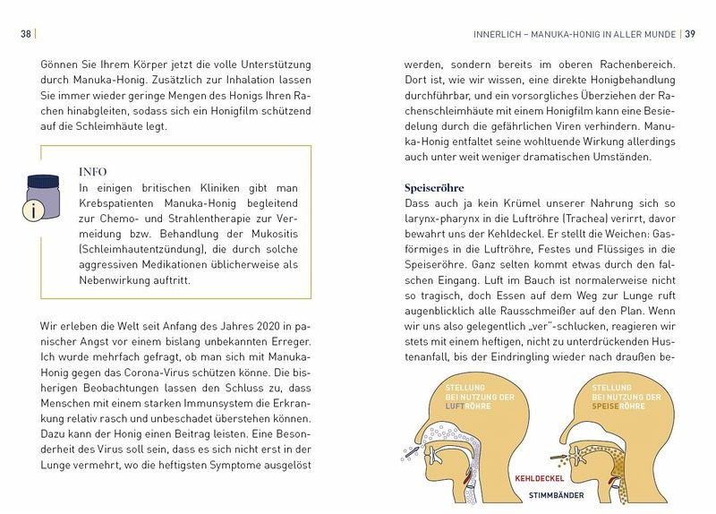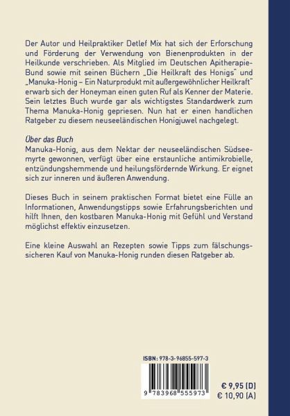 Manuka-Honig, aus dem Nektar der neuseeländischen Südseemyrte gewonnen, verfügt über eine erstaunliche antimikrobielle, entzündungshemmende und heilungsfördernde Wirkung. Er eignet sich zur inneren und äußeren Anwendung. Dieses Buch in seinem praktischen Format bietet eine Fülle an Informationen, Anwendungstipps sowie Erfahrungsberichten und hilft Ihnen, den kostbaren Manuka-Honig mit Gefühl und Verstand möglichst effektiv einzusetzen. Eine kleine Auswahl an Rezepten sowie Tipps zum fälschungssicheren Kauf von Manuka-Honig runden diesen Ratgeber ab.