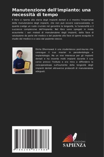Il libro ci riporta alla storia degli impianti dentali e ci mostra l'importanza della manutenzione degli impianti, che non può essere sopravvalutata, in quanto svolge un ruolo cruciale nel garantire la longevità, la funzionalità e il successo complessivo dell'impianto. Nel libro sono spiegati in modo esauriente i vari metodi di manutenzione degli impianti, dalla fase di valutazione da parte del medico e del paziente alla fase di igiene eseguita in studio dal medico o a casa dal paziente stesso.
