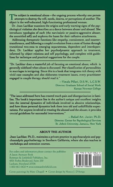Dr. Joan Lachkar examines the origins and early warning signs of the psychological violation she describes as a dance between abuser and abused. She goes on to introduce typologies of each (the narcissistic or passive-aggressive abuser, the unentitled self) and to explore the bases for their collusive attachments.