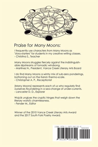 A book of poetry and short-stories, Wojcik writes in a straightforward and accessible way. Covering a variety of moods, Many Moons is at various times touching, humorous, heart-breaking, and whimsical. Many Moons contains 68 poems, 10 short-stories, and numerous other literary musings. This 4th Edition features some eighty pages of new material not found in the 3rd Edition. Winner of the 2010 Vance Creek Literary Arts Award and the 2017 South Fork Poetry Award.