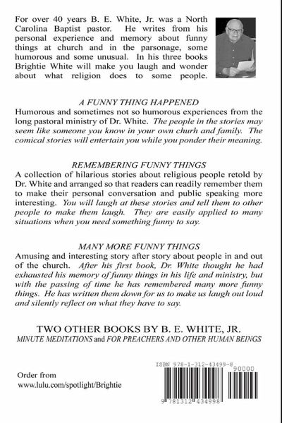 After his first book, Dr. White thought that he had exhausted his memory of funny things in his life and ministry, but with the passing of time he has remembered many more funny things. He has written them down to make us laugh out loud and silently reflect on what they have to say. Brightie White tells amusing and interesting story after story about people in and out of the church. You may have a hard time believing that some of the stories are true, but if you can't believe a preacher, whom can you believe? Most of the stories are humorous, but some of them are unusual. All are about real people and the way religion makes them act. Lessons can be learned from their antics and how things used to be and sometimes still are during the years of the author's life.