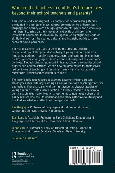 Introduction: Syncretic Literacy Studies: Starting Points 1. A Sociocultural Approach to Learning E. Gregory, S. Long & D. Volk Part 1: The Family Context: Siblings and Grandparents 2. Mediating Networks for Literacy Learning: The Role of Puerto Rican Siblings D. Volk with M. De Acosta 3. Samia and Sadaqat Play School: Early Bilingual Literacy At Home R. Drury 4. 'Right, get your book bags!': Siblings Playing School in Multiethnic London A. Williams 5. Buzz Lightyear in the Nursery: Intergenerational Literacy Learning in a Multi-Media Age C. Kelly 6. Storytelling and Latino Elders: What Can Children Learn? I. Olmedo Part 2: Friends as Teachers 7. Making a Place for Peer Interaction: Mexican American Kindergartners Learning Language and Literacy S. Long with D. Bell & J. Brown 8. Community School Pupils Re-interpret Their Knowledge of Chinese and Arabic for Primary School Peers C. Kenner 9. 'How do I read these words?': Bilingual Exchange Teaching Between Cantonese Speaking Peers Y. Chen & E. Gregory 10. Friendship Literacy: Young Children as Cultural and Linguistic Experts M. Datta 11. Learning to tb Just: Interactions of White Working Class Peers R. Rogers & M. Mosley Part 3: Learning in Community Settings 12. Change and Tradition in Literacy Instruction in a Samoan American Community A. Duranti, E. Ochs & E. Ta'ase 13. Multilingual Flexibility and Literacy Learning in an Urdu Community School L. Robertson 14. The African American Church: A Beacon of Light on the Pathway to Literacy for African American Children G. McMillon & P. A. Edwards 15. His Eye on the Sparrow: Teaching and Learning in an African American Church W. Haight & J. Carter-Black 16. Cultural Literacy in the World of Pueblo Children M. Romero Conclusion: Many Pathways: Implications of Syncretic Literacy Studies for Practice and Research
