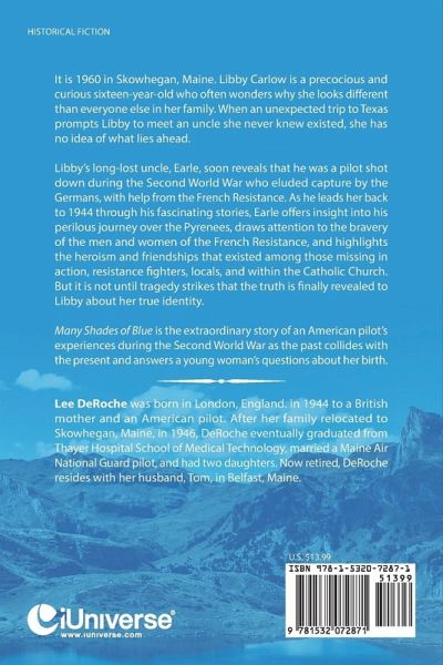It is 1960 in Skowhegan, Maine. Libby Carlow is a precocious and curious sixteen-year-old who often wonders why she looks different than everyone else in her family. When an unexpected trip to Texas prompts Libby to meet an uncle she never knew existed, she has no idea of what lies ahead. Libby's long-lost uncle, Earle, soon reveals that he was a pilot shot down during the Second World War who eluded capture by the Germans, with help from the French Resistance. As he leads her back to 1944 through his fascinating stories, Earle offers insight into his perilous journey over the Pyrenees, draws attention to the bravery of the men and women of the French Resistance, and highlights the heroism and friendships that existed among those missing in action, resistance fighters, locals, and within the Catholic Church. But it is not until tragedy strikes that the truth is finally revealed to Libby about her true identity. Many Shades of Blue is the extraordinary story of an American pilot's experiences during the Second World War as the past collides with the present and answers a young woman's questions about her birth.