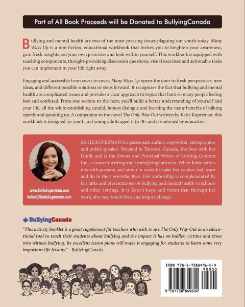 Are you being bullied? Is one of your friends struggling mentally? Do you teach students who could benefit from a mini unit on bullying and mental health? Are you a guidance counselor who wants to open the dialogue help kids move forward productively? Many Ways Up is an accessible and inclusive workbook on bullying and mental health, which accompanies the novel, The Only Way Out. Together, these two books are the perfect package, addressing two of the biggest issues plaguing our youth and young adults today. *** ENDORSED BY EDUCATORS *** ENDORSED BY BULLYINGCANADA * A portion of all proceeds will be donated to BullyingCanada This workbook guides you step by step, and shows you exactly how to make positive changes in your everyday life. It is filled with discussion questions, educational components, actionable tasks you can start implementing today and visual exercises to be completed right in the book! You'll learn how to:Be open to fresh perspectives Process eye-opening statistics we all need to be aware of Create new solutions and steps forward Make yourself impermeable to bullying behavior Look inward, set your own priorities and gain self-confidence Be mentally healthy in your everyday life Talk openly and speak up for yourself and others