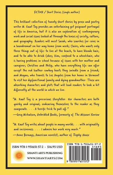 This brilliant collection of twenty short stories by prose and poetry writer M. Kaat Toy provides an entertaining yet poignant portrayal of life in America. It is also an exploration of contemporary work and social issues looked at through the lenses of society, culture, and geography. Readers will meet Sarah, who searches for coins in a laundromat on her way home from work; Claire, who wants only three things out of life: to live at the beach, to have blonde hair, and to be able to drink Cokes; Kim, confined to a wheelchair, who is having problems in school because of issues with her mother and caregiver; Christine and Philip, who have everything life can offer except the red leather cowboy boots they swindle from a friend; and Megan, who travels to Los Angeles from her home in Vermont to visit her dysfunctional family and dying grandmother. These are absorbing characters and plots that will lead readers to look a bit differently at the world in which we live.