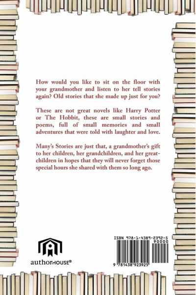 How would you like to sit on the floor with your grandmother and listen to her tell stories again? Old stories that she made up just for you? These are not great novels like Harry Potter or The Hobbit, these are small stories and poems, full of small memories and small adventures that were told with laughter and love. Many's Stories are just that, a grandmother's gift to her children, her grandchildren, and her great-children in hopes that they will never forget those special hours she shared with them so long ago.
