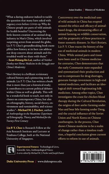 Controversy over the medicinal uses of wild animals in China has erupted around the ethics and efficacy of animal-based drugs, the devastating effect of animal farming on wildlife conservation, and the propensity of these practices to foster zoonotic diseases. In Mao's Bestiary, Liz P. Y. Chee traces the history of the use of medicinal animals in modern China. While animal parts and tissue have been used in Chinese medicine for centuries, Chee demonstrates that the early Communist state expanded and systematized their production and use to compensate for drug shortages, generate foreign investment in high-end animal medicines, and facilitate an ideological shift toward legitimating folk medicines. Among other topics, Chee investigates the craze for chicken blood therapy during the Cultural Revolution, the origins of deer antler farming under Mao and bear bile farming under Deng, and the crucial influence of the Soviet Union and North Korea on Chinese zootherapies. In the process, Chee shows Chinese medicine to be a realm of change rather than a timeless tradition, a hopeful conclusion given current efforts to reform its use of animals.