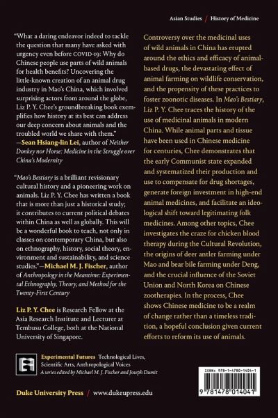 Controversy over the medicinal uses of wild animals in China has erupted around the ethics and efficacy of animal-based drugs, the devastating effect of animal farming on wildlife conservation, and the propensity of these practices to foster zoonotic diseases. In Mao's Bestiary, Liz P. Y. Chee traces the history of the use of medicinal animals in modern China. While animal parts and tissue have been used in Chinese medicine for centuries, Chee demonstrates that the early Communist state expanded and systematized their production and use to compensate for drug shortages, generate foreign investment in high-end animal medicines, and facilitate an ideological shift toward legitimating folk medicines. Among other topics, Chee investigates the craze for chicken blood therapy during the Cultural Revolution, the origins of deer antler farming under Mao and bear bile farming under Deng, and the crucial influence of the Soviet Union and North Korea on Chinese zootherapies. In the process, Chee shows Chinese medicine to be a realm of change rather than a timeless tradition, a hopeful conclusion given current efforts to reform its use of animals.