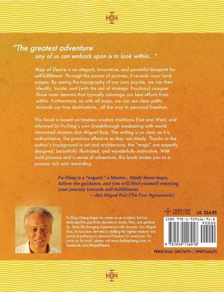 NEWLY REVISED! Map of Desire is an elegant, innovative, and powerful blueprint for self-fulfillment. Through the power of pictures, it reveals inner landscapes. By seeing the topography of our own psyche, we can then identify, locate and (with the aid of transformative Practices), conquer those inner demons that typically sabotage our best efforts. Furthermore, as with all maps, we can see clear paths towards our true destinations all the way to personal freedom. Thanks to Fu-Ding Cheng's background in art and architecture, the "maps" are expertly designed, beautifully illustrated, and wonderfully instructive. Based on timeless wisdom traditions East and West, and informed by his own breakthrough awakening with world renowned shaman don Miguel Ruiz, the writing is as clear as it is authoritative, the practices effective as they are timely. With bold promise and sense of adventure, this book invites you to a journey rich and rewarding. "Fu-Ding is a nagual, a Master...Study these maps, follow the guidance, and you will find yourself enjoying your journey towards self-fulfillment." --don Miguel Ruiz, Author of The Four Agreements Fu-Ding Cheng began his career as an architect, but has dedicated the past three decades to books, films, and spirituality. Since life-changing experiences with shaman, don Miguel Ruiz, he has been devoted to distillng the highest wisdoms into practical pathways to personal freedom for everyone. For more on his work, please visit www.FuDingCheng.com or Facebook.com/MapofDesire.