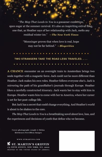 "Romantic and unforgettable." -Nicholas Sparks J.P. Monninger's The Map That Leads to You is a breathtaking novel about love, loss, and the best-laid plans that are meant to be broken. Two strangers take the road less traveled... Heather Mulgrew's world is already mapped out: she is going to travel abroad with her friends after college, come back to a great career in September, and head into a life where not much is left to chance. But that was before an encounter on an overnight train introduces her to Jack, a passionate adventurer who changes the course of her journey and her life. Throwing Heather's careful itinerary to the wind, they follow Jack's grandfather's journal through post-World War II era Europe: Vienna, Budapest, Turkey-exotic places that serve only to heighten their feelings. As September looms, Jack urges Heather to stay with him, to keep traveling, to give in to the romance of their experience; Heather convinces him to return to the United States. Jack has a secret that could change everything. And Heather's world is about to be shaken to the core. One of the New York Post's "This Week's Must-Read Books" Praise for The Map that Leads to You: "The Map That Leads to You is a gossamer confection, spun sugar at the summer carnival. It's also an inspiriting estival fling, one that, as Heather says of her relationship with Jack, melts any residual winter ice. -The New York Times Book Review "Will strike a chord with fans of Nicholas Sparks' sweeping and sentimental tales." -Booklist "Readers who love romance novels with a bittersweet twist will cling to every word...Recommended for fans of Kristin Hannah and Nicholas Sparks." -School Library Journal
