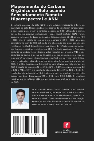 O carbono orgânico do solo (SOC) é um indicador importante e fiável da qualidade do solo. Neste estudo, os espectros do solo foram caracterizados e analisados para prever o conteúdo espacial de SOC, utilizando a técnica de modelação preditiva multivariada - rede neural artificial (RNA). Foram gerados conjuntos de dados de imagens hiperespectrais EO1-Hyperion (400 - 2500 nm), à escala do campo e do laboratório (350 - 2500 nm), que consistem no teor de SOC estimado em laboratório das amostras de solo recolhidas (variável dependente) e nos dados de reflexão correspondentes das bandas espectrais sensíveis ao SOC (variáveis preditivas). Para cada conjunto de dados, foram desenvolvidos modelos de previsão ANN e três conjuntos de dados (à escala da imagem, à escala do campo e à escala do laboratório) revelaram desempenhos significativos da rede para treino, teste e validação, indicando uma boa generalização da rede para o teor de SOC. A análise baseada na RNA mostrou uma elevada previsão do teor de SOC à escala da imagem (R2 = 0,93 e RPD = 3,19), à escala do campo (R2 = 0,92 e RPD = 3,17) e à escala do laboratório (R2 = 0,95 e RPD = 3,16). Os resultados da validação da RNA indicaram que os modelos de previsão tiveram um bom desempenho (R2 = 0,90) com RMSE 0,070. O resultado mostrou que os métodos ANN têm um grande potencial para estimar o teor de SOC.