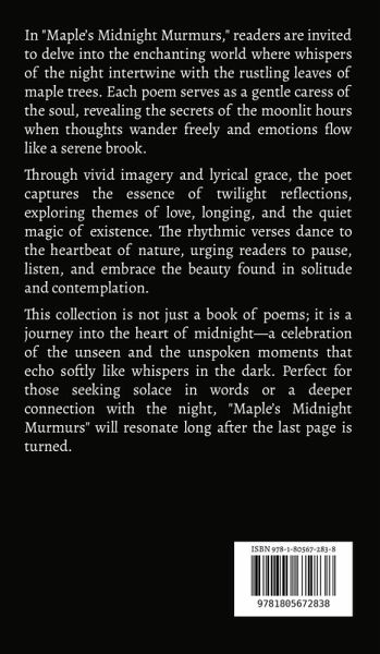 In "Maple's Midnight Murmurs," readers are invited to delve into the enchanting world where whispers of the night intertwine with the rustling leaves of maple trees. Each poem serves as a gentle caress of the soul, revealing the secrets of the moonlit hours when thoughts wander freely and emotions flow like a serene brook. Through vivid imagery and lyrical grace, the poet captures the essence of twilight reflections, exploring themes of love, longing, and the quiet magic of existence. The rhythmic verses dance to the heartbeat of nature, urging readers to pause, listen, and embrace the beauty found in solitude and contemplation. This collection is not just a book of poems; it is a journey into the heart of midnight-a celebration of the unseen and the unspoken moments that echo softly like whispers in the dark. Perfect for those seeking solace in words or a deeper connection with the night, "Maple's Midnight Murmurs" will resonate long after the last page is turned.