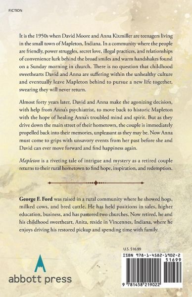 It is the 1950s when David Moore and Anna Kixmiller are teenagers living in the small town of Mapleton, Indiana. In a community where the people are friendly, power struggles, secret love, illegal practices, and relationships of convenience lurk behind the broad smiles and warm handshakes found on a Sunday morning in church. There is no question that childhood sweethearts David and Anna are suffering within the unhealthy culture and eventually leave Mapleton behind to pursue a new life together, swearing they will never return. Almost forty years later, David and Anna make the agonizing decision, with help from Anna's psychiatrist, to move back to historic Mapleton with the hope of healing Anna's troubled mind and spirit. But as they drive down the main street of their hometown, the couple is immediately propelled back into their memories, unpleasant as they may be. Now Anna must come to grips with unsavory events from her past before she and David can ever move forward and find happiness again. Mapleton is a riveting tale of intrigue and mystery as a retired couple returns to their rural hometown to find hope, inspiration, and redemption.