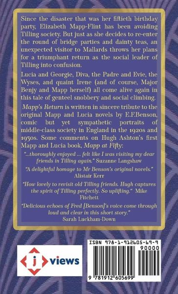 Since the disaster that was her fiftieth birthday party, Elizabeth Mapp-Flint has been avoiding Tilling society. But just as she decides to re-enter the round of bridge parties and dainty teas, an unexpected visitor to Mallards throws her plans for a triumphant return as the social leader of Tilling into confusion. Lucia and Georgie, Diva, the Padre and Evie, the Wyses, and quaint Irene (and of course, Major Benjy and Mapp herself) all come alive again in this tale of genteel snobbery and social climbing. Mapp's Return is written in sincere tribute to the original Mapp and Lucia novels by E.F.Benson, comic but yet sympathetic portraits of middle-class society in England in the 1920s and 1930s, and forms a sequel to Mapp at Fifty by the same author, a volume which has received many plaudits from lovers of the original stories and characters.
