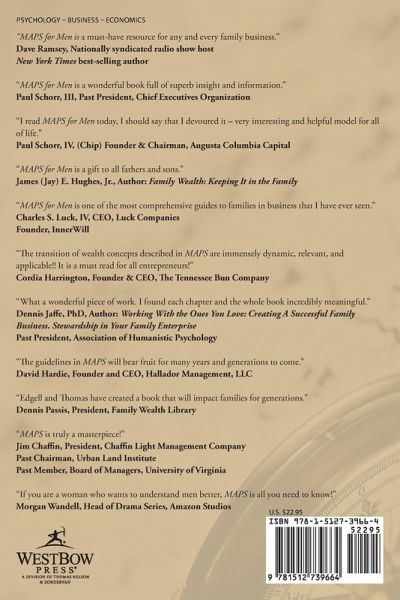 "MAPS for Men is a must-have resource for any and every family business." Dave Ramsey, Nationally syndicated radio show host New York Times best-selling author "MAPS for Men is a wonderful book full of superb insight and information." "Paul Schorr, III, Past President, Chief Executives Organization "I read MAPS for Men today, I should say that I devoured it - very interesting and helpful model for all of life." Paul Schorr, IV, (Chip) Founder & Chairman, Augusta Columbia Capital "MAPS for Men is a gift to all fathers and sons." James (Jay) E. Hughes, Jr., Author: Family Wealth: Keeping it in the Family "MAPS for Men is one of the most comprehensive guides to families in business that I have ever seen." Charles S. Luck, IV, CEO, Luck Companies Founder, InnerWill "The transition of wealth concepts described in MAPS are immensely dynamic, relevant, and applicable!! It is a must read for all entrepreneurs!" Cordia Harrington, Founder & CEO, The Tennessee Bun Company "What a wonderful piece of work. I found each chapter and the whole book incredibly meaningful." Dennis Jaffe, PhD, Author: Working With the Ones You Love: Creating A Successful Family Business. Stewardship in Your Family Enterprise Past President, Association of Humanistic Psychology "The guidelines in MAPS will bear fruit for many years and generations to come." David Hardie, Founder and CEO, Hallador Management, LLC "Edgell and Thomas have created a book that will impact families for generations." Dennis Passis, President, Family Wealth Library "MAPS is truly a masterpiece!" Jim Chaffin, President, Chaffin Light Management Company Past Chairman, Urban Land Institute Past Member, Board of Managers, University of Virginia "If you are a woman who wants to understand men better, MAPS is all you need to know!" Morgan Wandell, Head of Drama Series, Amazon Studios