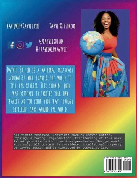 Take a journey around the world through 41 pages of uniquely designed illustrations perfect to color, tear and frame. Color your way around the world, discover new ways to look at our planet through different interpretations of maps. Created by national travel personality, Dayvee Sutton, there are a mix of standard maps which beautifully stand on their own, and maps enhanced with mandalas and other handmade designs. Perfect entertainment for ages 4-104.