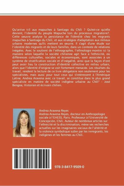 Qu'arrive t-il aux mapuches à Santiago du Chili ? Qu'est-ce qu'elle devient, l'identité du peuple Mapuche lors du processus migratoire?. Cette oeuvre analyse la persistance de l'identité chez les migrants mapuches à Santiago du Chili, et aux stratégies d'adaptation aux milieux urbains modernes qu'ils mettent en oeuvre. Il s'agit d'une étude sur l'identité des migrants et de leurs familles, dans un contexte de relations inégales. Avec le soutient de l'ethnographie, l'ethnologie montre ici la manière selon laquelle la société chilienne agit face à l'ethnicité, où différences culturelles, sociales et économiques, sont associées à un système de stratification sociale et d'inégalité, ainsi que la façon d'ont peut avoir lieu la construction d'identité collective en milieu urbain, alors que l'identité d'origine se voit fortement menacée. Les résultats du travail, rendent la lecture de ce livre obligatoire non seulement pour les spécialistes, mais aussi pour tout ceux qui s'intéressent à l'Amérique Latine. Andrea Aravena avec ce travail, se constitue dans le plus grand spécialiste en matière de société indigène urbaine au Chili" - José Bengoa, Historien et écrivain chilien.