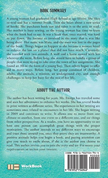 A young woman had graduated High School at age fifteen. She likes to read and has a summer break. Then she hears about a new series of books. She purchases book one and takes it to the attic to read. Her mother is busy sewing, so the young woman has time to learn what the book had to say. It was a book that, once started, was hard to put down. She became so involved in the story that it was like being there. Her name was Mara, and she soon was lost in the pages of the book. Things began to happen as she became a woman hired to enforce the law on a planet that did not have much. Currently, she traveled with two animals. A wolf and a horse moved with her wherever she went. Before long, she would have to handle a group of people that were trying to take over the town of her assignment. She found an Ali in the form of a young boy. Then others began to offer aid in many ways. Before long, her group consisted of children, adults, the animals, a mission, an underground city, and enough challenges to keep her busy for the rest of her life.