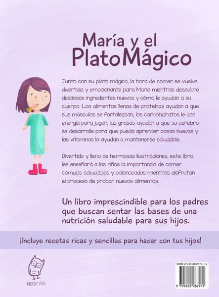 Junto con su plato mágico, la hora de comer se vuelve divertida y emocionante para María mientras descubre deliciosos ingredientes nuevos y cómo le ayudan a su cuerpo. Los alimentos llenos de proteínas ayudan a que sus músculos se fortalezcan; los carbohidratos le dan energía para jugar; las grasas ayudan a que su cerebro se desarrolle para que pueda aprender cosas nuevas y las vitaminas la ayudan a mantenerse saludable. Divertido y lleno de hermosas ilustraciones, este libro les enseñará a los niños la importancia de comer comidas saludables y balanceadas mientras disfrutan el proceso de probar nuevos alimentos. Un libro imprescindible para los padres que buscan sentar las bases de una nutrición saludable para sus hijos.