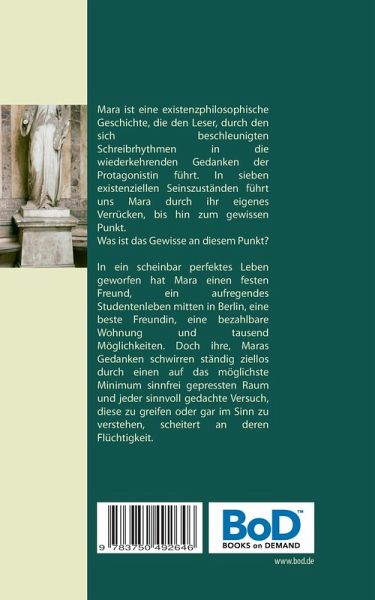 Mara ist eine existenzphilosophische Geschichte, die den Leser, durch den sich beschleunigten Schreibrhythmen in die wiederkehrenden Gedanken der Protagonistin führt. In sieben existenziellen Seinszuständen führt uns Mara durch ihr eigenes Verrücken, bis hin zum gewissen Punkt.Was ist das Gewisse an diesem Punkt?In ein scheinbar perfektes Leben geworfen hat Mara einen festen Freund, ein aufregendes Studentenleben mitten in Berlin, eine beste Freundin, eine bezahlbare Wohnung und tausend Möglichkeiten. Doch ihre, Maras Gedanken schwirren ständig ziellos durch einen auf das möglichste Minimum sinnfrei gepressten Raum und jeder sinnvoll gedachte Versuch, diese zu greifen oder gar im Sinn zu verstehen, scheitert an deren Flüchtigkeit. Was ist es, was sie zweifeln lässt? Immer und immer wieder und immer und immerfort kreisen die Gedanken und Mara denkt in Kreisen. Was lässt sie so verrücken? Was ist dieser gewisse Punkt, den sie ansteuert, aber nicht klar fassen kann?Sie, Mara nimmt uns mit auf eine Reise des Verrückens. Sie, Mara zeigt uns ihn, den gewissen Punkt. Das Gewisse lässt uns atemlos werden. Der gewisse Punkt ist nicht fest fixierbar. Das Gewisse lässt uns rutschen und ganz schwammig sein. Das Gewisse lässt uns verrücken. So wie auch Mara verrückte, in sieben existenziellen Akten bis hin zum gewissen Punkt.
