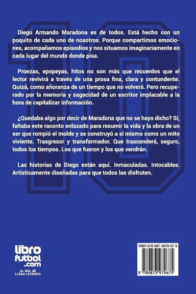 Diego Armando Maradona es de todos. Está hecho con un poquito de cada uno de nosotros. Porque compartimos emociones, acompañamos episodios y nos situamos imaginariamente en cada lugar del mundo donde pisa. Proezas, epopeyas, hitos no son más que recuerdos que el lector revivirá a través de una prosa fina, clara y contundente. Quizá, como añoranza de un tiempo que no volverá. Pero recuperado por la memoria y sagacidad de un escritor implacable a la hora de capitalizar información. ¿Quedaba algo por decir de Maradona que no se haya dicho? Sí, faltaba este raconto enlazado para resumir la vida y la obra de un ser que rompió el molde y se construyó a sí mismo como un mito viviente. Trasgresor y transformador. Que trascenderá, seguro, todos los tiempos. Los que fueron y los que vendrán. Las historias de Diego están aquí. Inmaculadas. Intocables. Artísticamente diseñadas para que todos las disfruten.