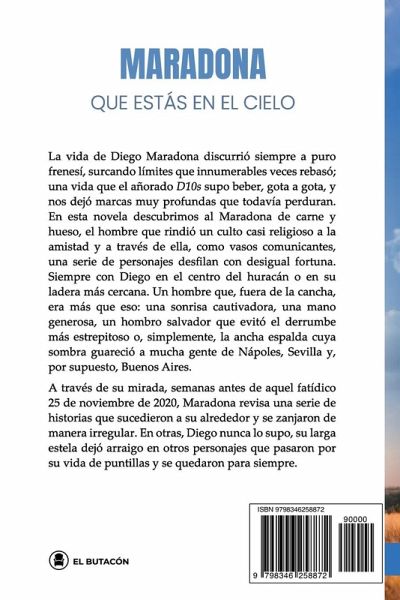Es novela y lo único real se llama Diego Armando Maradona, Semanas antes de aquel fatídico 25 de noviembre de 2020, en su retiro de Tigre (Argentina), Diego revisa una serie de hechos extraordinarios que le sucedieron o le pudieron suceder. En esta historia, cargada de virtudes y defectos, de gente corriente y gente extraordinaria, de mafiosos de baja estofa y personajes desesperados, la muerte le lanza el guante a la vida y todo queda en empate. Aires de venganza soplan con fuerza, pero la brisa de la amistad, del amor y algunos chispazos de humor, se dejan sentir a lo largo de estas páginas, un territorio que destila luz de humanidad, la que muchas veces derramó Maradona. : Buenos Aires, Nápoles y Sevilla, las tres ciudades que marcaron la vida de D10s, comparten territorio y mantel. Se refugiaba en los valores de la amistad porque tenía una condición indispensable que fue su generosidad., asegura el gran Víctor Hugo Morales, que prologa esta historia..