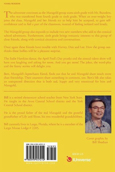 The adventure continues as the Maragold group starts sixth grade with Mr. Bunnlow, who was transferred from fourth grade to sixth grade. When an over-weight boy joins the class, Maragold and her friends try to help him be accepted, to gain self-confidence and to feel a part of the classroom, instead of feeling isolated and lonely. The Maragold group also expands to include two new members who add to the comical school adventures. Furthermore, sixth grade brings romantic interests to this group of close friends, along with comical situations and conversations. Once again these friends have trouble with Harvey, Dan and Lee. How the group out-thinks these bullies will be a pleasant surprise. The Sadie Hawkins dance, the April Fool's Day pranks and the annual talent show will have you laughing and asking for more. And you get more! The jokes, the word-play and the funny stories will delight you. Bert, Maragold's leprechaun friend, finds out that he and Maragold share much more than friendship. Their ancestors share something in common, too. Bert's life also takes an unexpected direction that is both sad, happy and very emotional for him and Maragold.