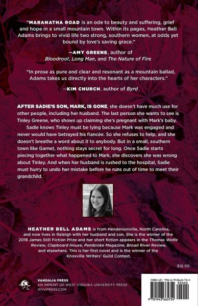 Heather Bell Adams's first novel, Maranatha Road (West Virginia University Press 2017), won the gold medal for the Southeast region in the Independent Publisher Book Awards and was named to Deep South Magazine's Fall/Winter Reading List. Her short fiction, which has won the James Still Fiction Prize and Carrie McCray Memorial Literary Award, appears in The Thomas Wolfe Review, Pembroke Magazine, Broad River Review, The Petigru Review, Pisgah Review, and elsewhere. A native of Hendersonville, North Carolina, she currently is an attorney living in Raleigh.