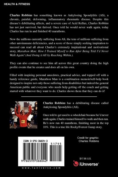 Charles Robbins has something known as Ankylosing Spondylitis (AS), a chronic, painful, deforming, inflammatory rheumatic disease. Despite this disease's debilitating affects, and a severe case of Acid Reflux, Charles Robbins has not just survived, but thrived. Once told he would never walk again, today Charles has run in and finished 40 marathons. Now the millions currently suffering from AS, the tens of millions suffering from other autoimmune deficiencies, and a score of those simply seeking inspiration to succeed can read all about Charles's extremely inspirational and motivational story, Marathon Man: How I Trained Myself to Run After Being Told I'd Never Walk Again! (And Doing it All by Reaching Within.). They can also continue to see him all across this great country doing the high profile events that he creates and does all on his own. Filled with inspiring personal anecdotes, practical advice, and topped off with a handy reference guide, Marathon Man is a combination memoir/self-help book designed to inspire not only those suffering from disabilities but indeed the general American public and everyone who needs help getting off the couch and getting started with whatever they want to do. Charles shows them that they can do it!