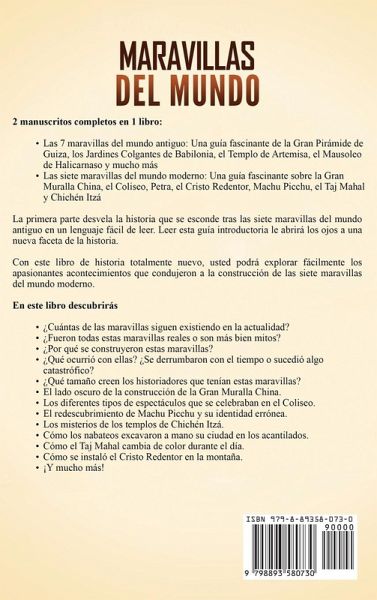 2 manuscritos completos en 1 libro: Las 7 maravillas del mundo antiguo: Una guía fascinante de la Gran Pirámide de Guiza, los Jardines Colgantes de Babilonia, el Templo de Artemisa, el Mausoleo de Halicarnaso y mucho más Las siete maravillas del mundo moderno: Una guía fascinante sobre la Gran Muralla China, el Coliseo, Petra, el Cristo Redentor, Machu Picchu, el Taj Mahal y Chichén Itzá En la primera parte de este libro aprenderá las respuestas a las siguientes preguntas: ¿Cuántas de las maravillas siguen existiendo en la actualidad? ¿Fueron todas estas maravillas reales o son más bien mitos? ¿Por qué se construyeron estas maravillas? ¿Qué ocurrió con ellas? ¿Se derrumbaron con el tiempo o sucedió algo catastrófico? ¿Qué tamaño creen los historiadores que tenían estas maravillas? En la segunda parte de este libro, usted: El lado oscuro de la construcción de la Gran Muralla China. Los diferentes tipos de espectáculos que se celebraban en el Coliseo. El redescubrimiento de Machu Picchu y su identidad errónea. Los misterios de los templos de Chichén Itzá. Cómo los nabateos excavaron a mano su ciudad en los acantilados. Cómo el Taj Mahal cambia de color durante el día. ¡Y mucho más!
