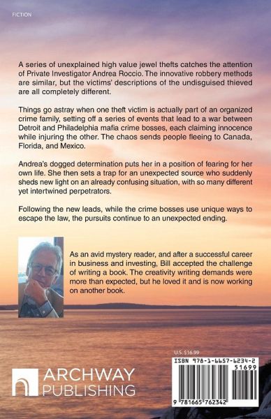 A series of unexplained high value jewel thefts catches the attention of Private Investigator Andrea Roccio. The innovative robbery methods are similar, but the victims' descriptions of the undisguised thieved are all completely different. Things go astray when one theft victim is actually part of an organized crime family, setting off a series of events that lead to a war between Detroit and Philadelphia mafia crime bosses, each claiming innocence while injuring the other. The chaos sends people fleeing to Canada, Florida, and Mexico. Andrea's dogged determination puts her in a position of fearing for her own life. She then sets a trap for an unexpected source who suddenly sheds new light on an already confusing situation, with so many different yet intertwined perpetrators. Following the new leads, while the crime bosses use unique ways to escape the law, the pursuits continue to an unexpected ending.