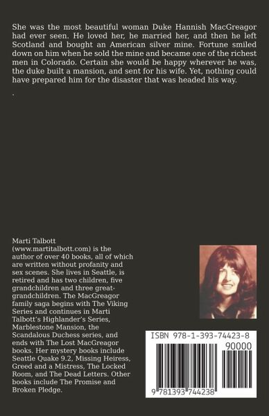 She was the most beautiful woman Duke Hannish MacGreagor had ever seen. He loved her, he married her, and then he left Scotland and bought an American silver mine. Fortune smiled down on him when he sold the mine and became one of the richest men in Colorado. Certain she would be happy wherever he was, the duke built a mansion, and sent for his wife. Yet, nothing could have prepared him for the disaster that was headed his way. .